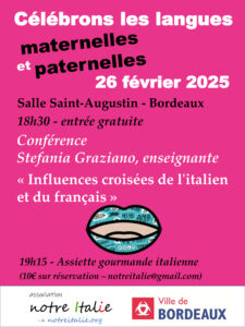 Célébrons les langues maternelles & paternelles, journées organisées par la ville de Bordeaux avec la participation de Notre Italie, le samedi 17 février, salle Saint-Augustin de Bordeaux (entrée gratuite)
